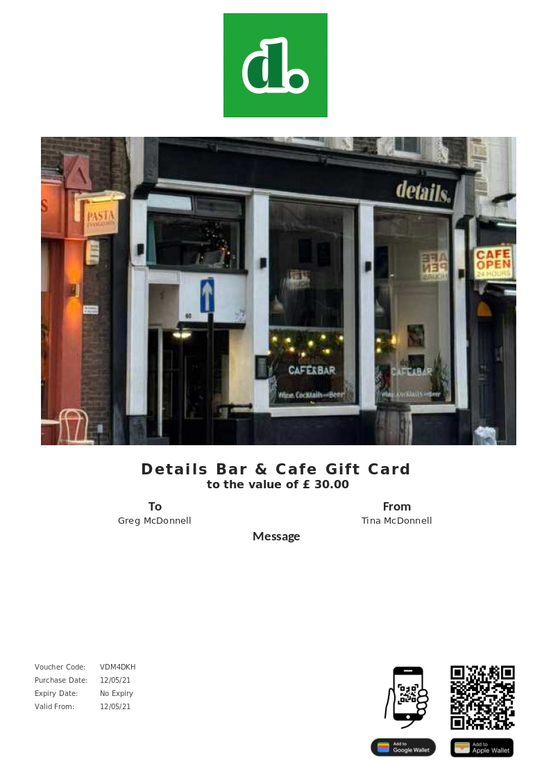 Details Bar & Cafe allows you to purchase instantly printable gift vouchers, special offers and tickets using the Voucher Connect platform.